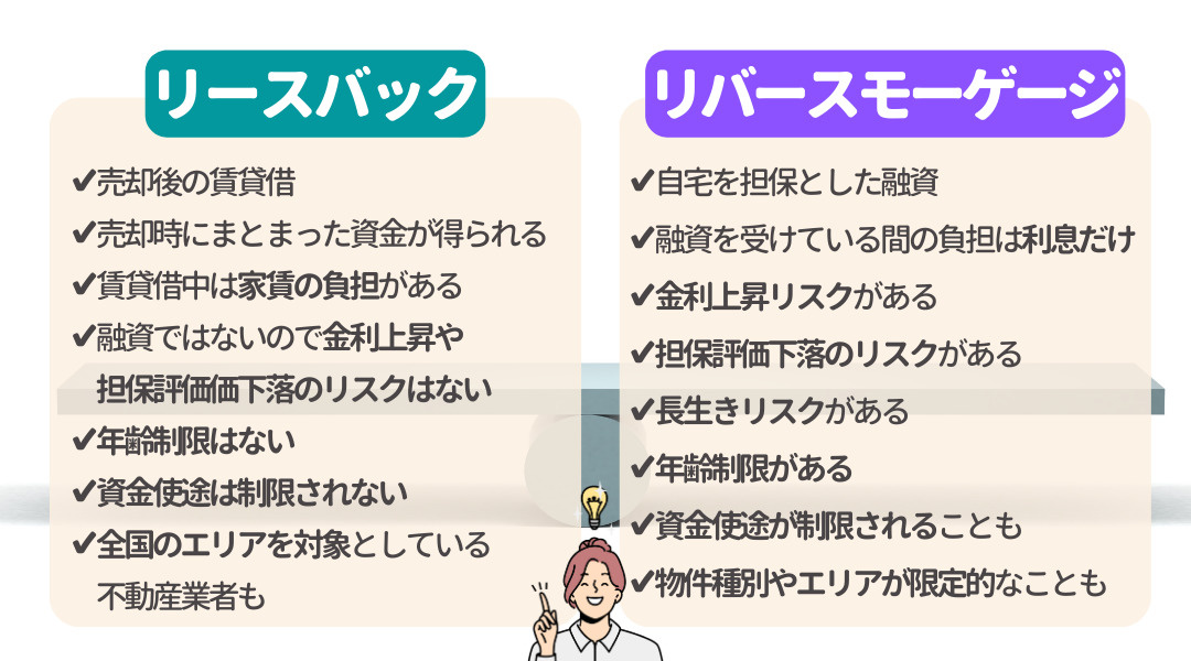 リースバックとよく比較されるものとして「リバースモーゲージ」が挙げられます。両者は、自宅を活用した資金調達方法という点は同じですが、似て非なるもの。リバースモーゲージとリースバックは、どこがどう違うのでしょうか?