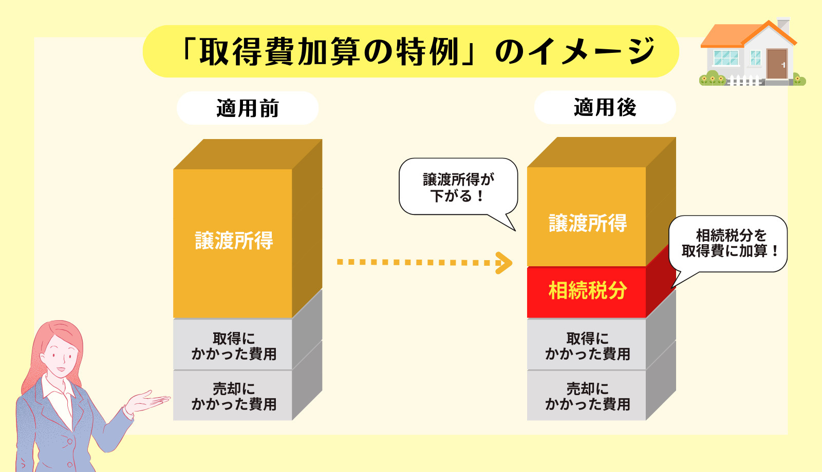 取得費加算の特例とは、売却した不動産を相続したときに納税した相続税分を取得費に加算し、譲渡所得を引き下げる効果のある特例です。譲渡所得とは、簡単にいえば売却益を指します。譲渡所得にかかる税率は、被相続人が所有していた期間を含めた所有期間が5年を超える場合は20.315%。たとえば、500万円の譲渡所得が出た場合、100万円以上の税金を納めなければなりません。